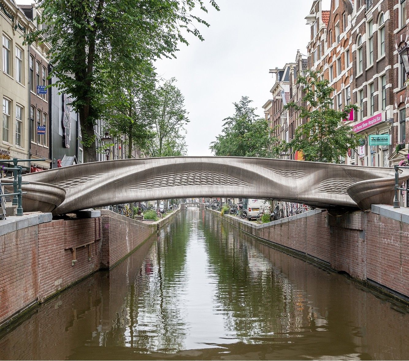 MX3D 12 m stainless‑steel 3D‑printed pedestrian bridge in Amsterdam using WAAM/DED technology, smart‑sensor network included.