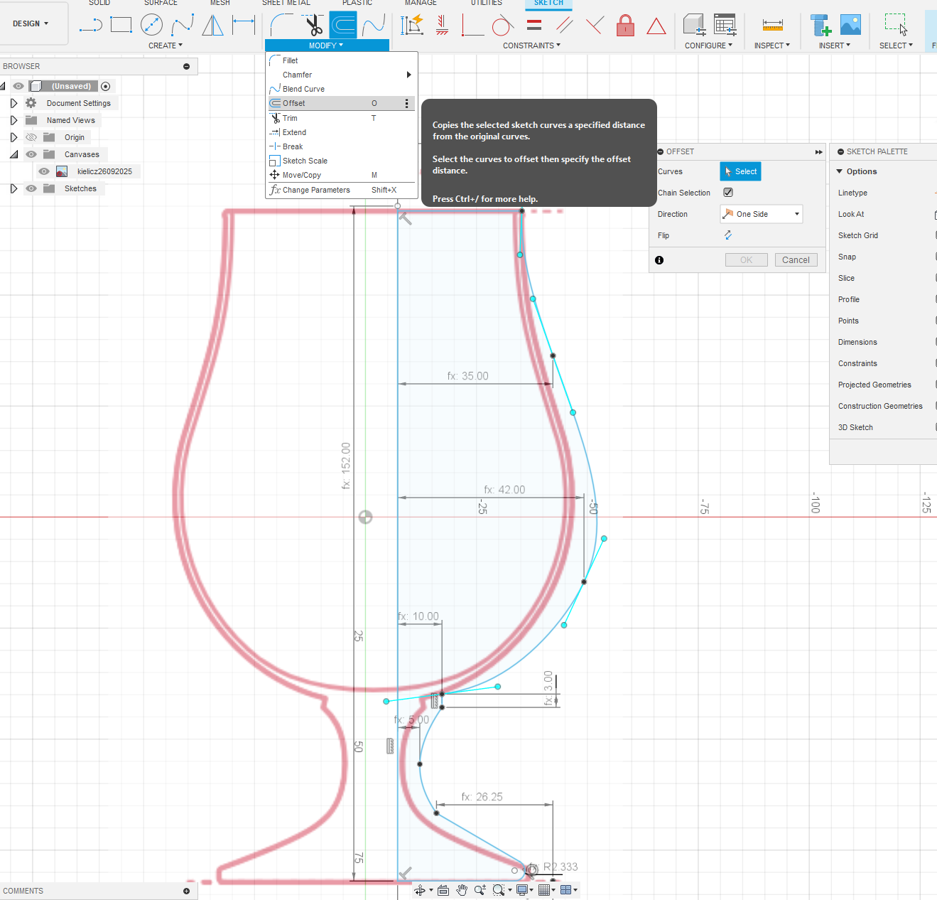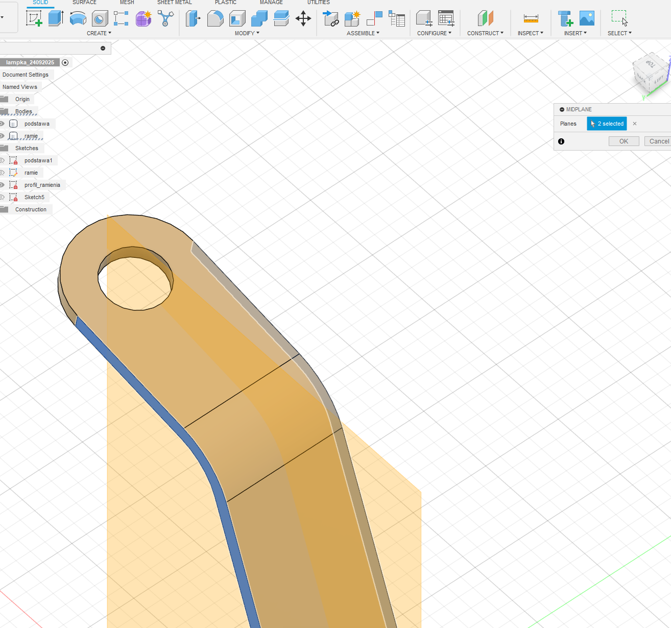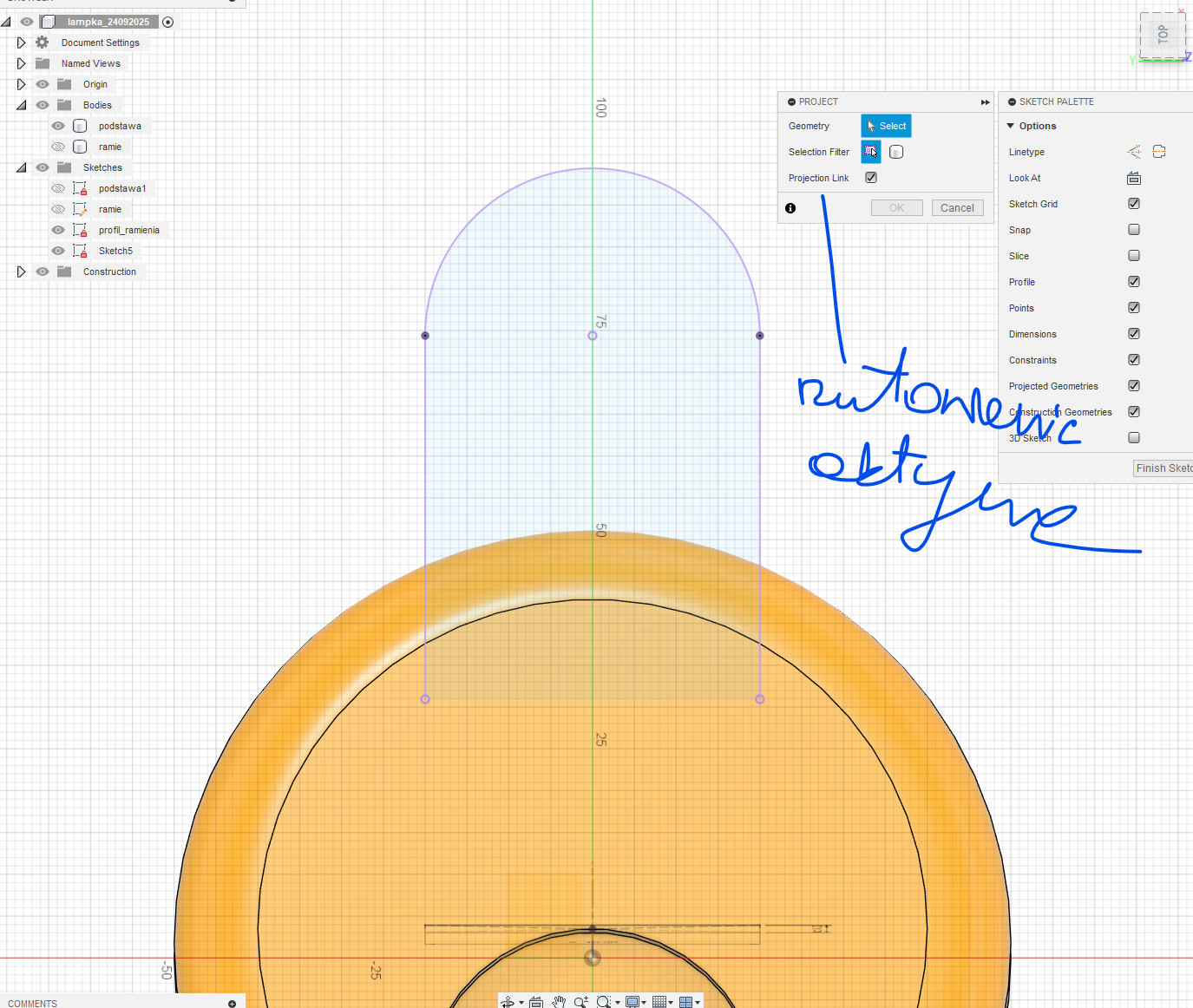 Importujemy do fusiona środkowy profil na pionowej płaszczyźnie (canvas), kalibrujemy (możemy też w calach inch), nowy szkic na tej samej płaszczyźnie,