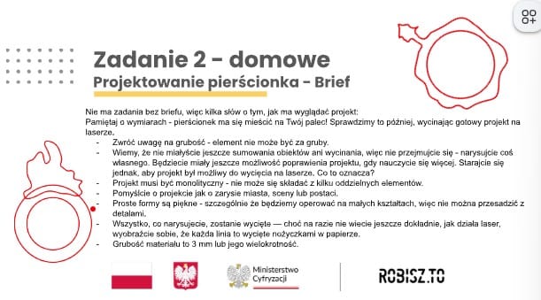 Nie ma zadania bez briefu, więc kilka słów o tym, jak ma wyglądać projekt: Pamiętaj o wymiarach - pierścionek ma się mieścić na Twój palec! Sprawdzimy to później, wycinając gotowy projekt na laserze.