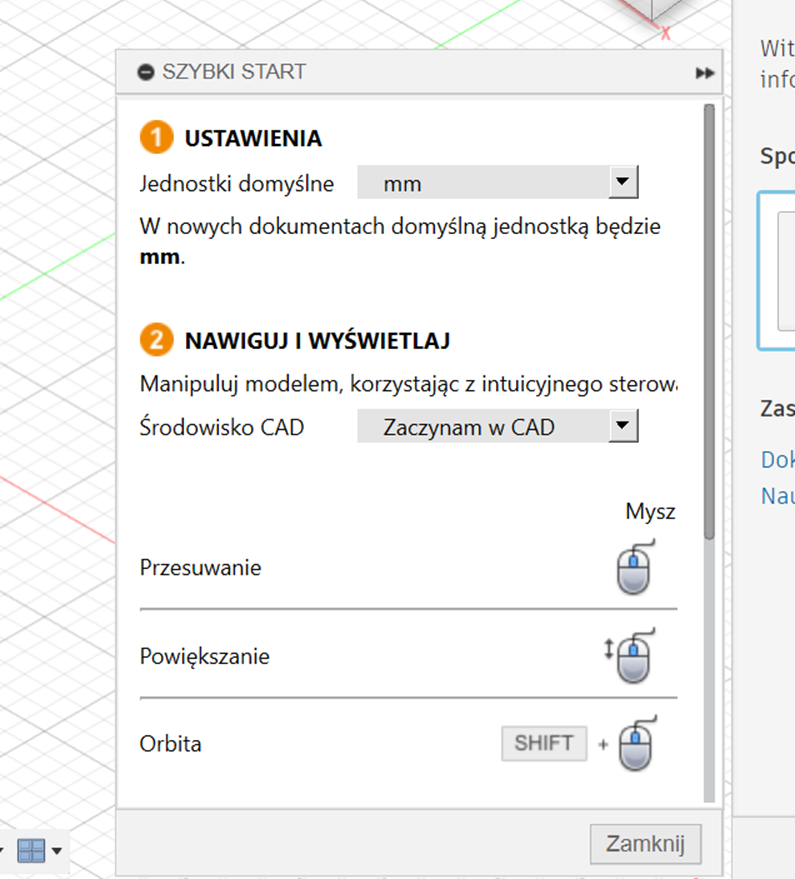 Scroll na myszce-przesuwamy widok góra-dół Shift + Scroll - obracamy widok 360* Nie używamy gotowych kształtów! Sami je tworzymy XYZ - trzy płaszczyzny (podpowiedź - RGB - red-green-blue) niebieski wysokość. Pudełeczko w prawym górnym roku pomaga Gdy kształt jest zamknięty to zmienia kolor na niebieski-powstaje PROFIL (zamknięty wycinek szkicu) Sprawdzamy, czy jednostką miary są mm