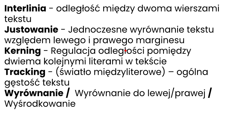 - unikanie "sierot" i "wdów"(błędy estetyczne, zły podział na strony, spójniki, pojedyncze wyrazy) + bękartów i szewców