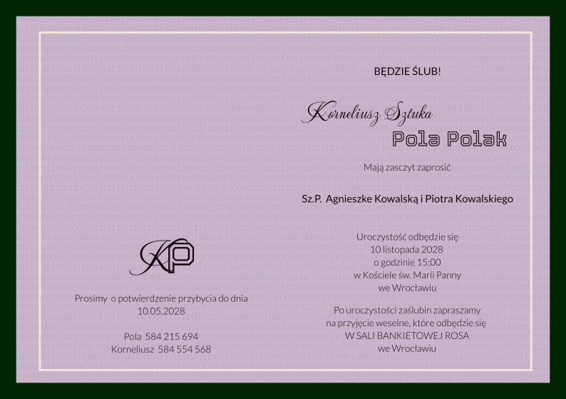 Zaproszenie Ślubne "Kod i Płótno" (zadanie domowe) Opis klienta: Ta sama para, dla której projektowałaś monogram, potrzebuje teraz pełnego projektu zaproszenia ślubnego. Musi ono być spójne stylistycznie z monogramem i jasno komunikować wszystkie niezbędne informacje.