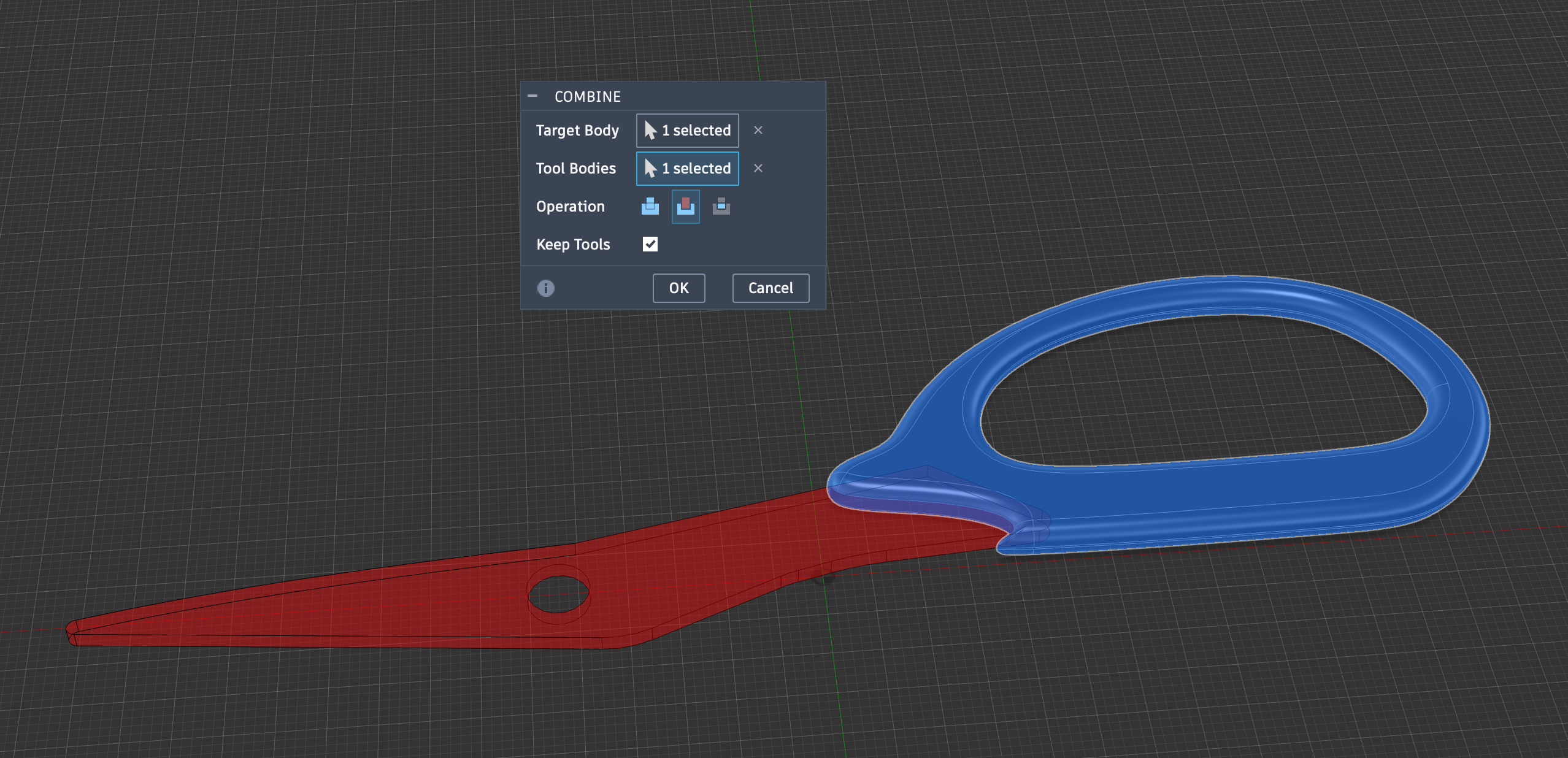 Ważne pod druk, należy zrobić otwór jeżeli jeden obiekt wychodzi z drugiego. W tym przypadku ostrze z rączki, dlatego rączka jest ,,Target Body'' a ostrze ,,Tool body''. Aby obiekt wycinający otwór, nam nie zniknął należy zaznaczyć ,,Keep Tools''