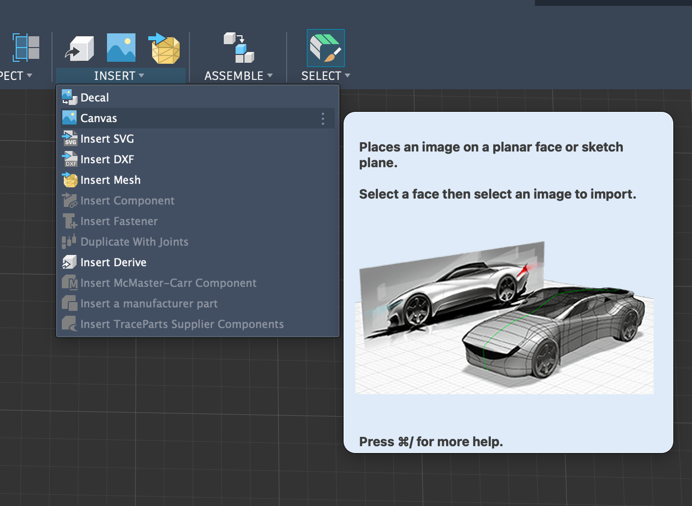 Aby załadować zdjęcie pomocnicze trzeba wybrać (Insert-> Canvas). W ,,drzewie życia'' oczko przy zakładce Canvas'' musi być otwarte , bo inaczej zdjęcie, które ładujemy będzie niewidoczne ;)