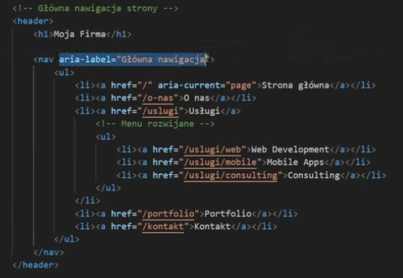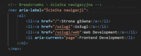 Zwróć uwagę, że w elemencie listy z aria-current="page" NIE MA LINKU!
