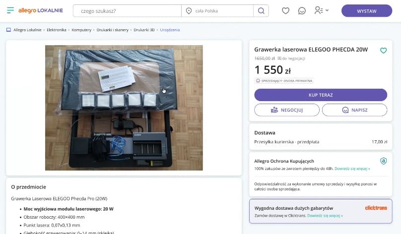 Kup teraz: Grawerka laserowa ELEGOO PHECDA 20W za 1550,00 zł i odbierz w mieście Warszawa. Szybko i bezpiecznie w najlepszym miejscu dla lokalnych Allegrowiczów.