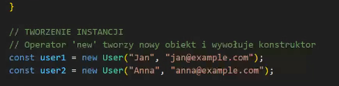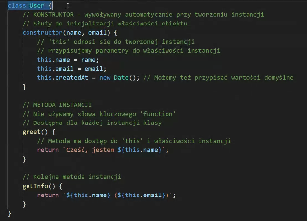 constructor: To specjalna metoda wewnątrz klasy, która jest uruchamiana, gdy tworzony jest nowy obiekt. Służy do inicjalizacji właściwości obiektu. W konstruktorze możemy również umieścić wartości domyślne (np. this.isActive = false). To przydatne zwłaszcza przy tworzeniu wielu obiektów, które mają posiadać takie wartości. - Tworzenie obiektów: Obiekty tworzy się przy użyciu słowa kluczowego