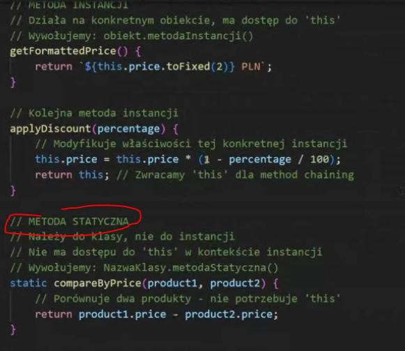 Metody instancji klasy definiujemy bez słowa kluczowego function! Metoda będzie dostępna dla każdej instancji klasy