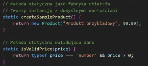 Służą do operacji związanych z klasą jako całością. Są to głównie fabryki obiektów, walidatory, etc. Stanowią narzędzie klasy, dla wszystkich instancji. Metody statyczne nie mają dostępu do this.