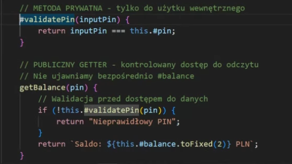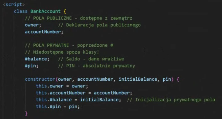 Pola prywatne wymagają wewnętrznych metod (w tym metod prywatnych, które również są definiowane z użyciem symbolu hash ( # ) ) by uzyskać do nich dostęp.