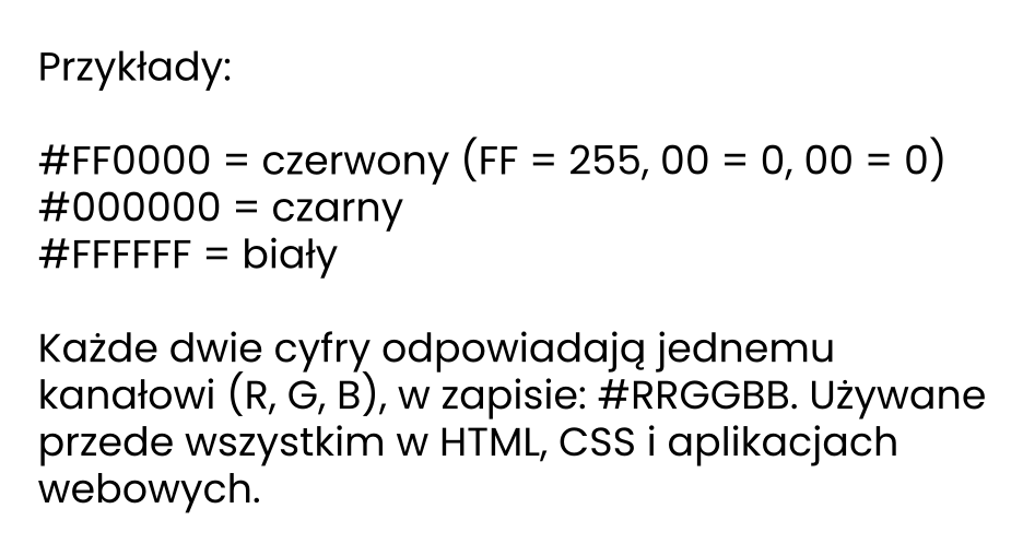 - Zapis koloru w systemie szesnastkowym (#RRGGBB).