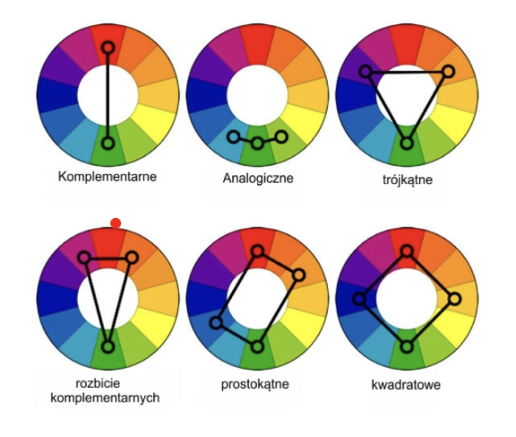 - Wskazuje kolory dopełniające się (kontrastowe), analogiczne (podobne), a także zestawienia harmonijne.