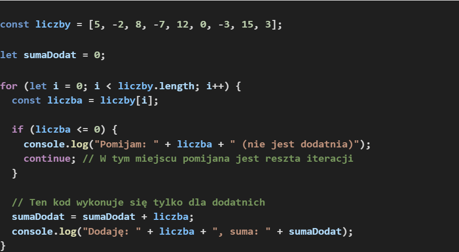 Przykład pętli, która przetwarza tylko liczby dodatnie:
