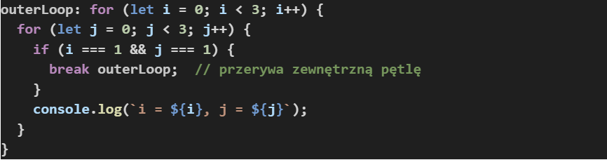 Label Statements - pozwalają na definiowanie pętli, które za pomocą break chcemy przerwać, jeżeli szukamy jednego elementu dla wielu pętli.