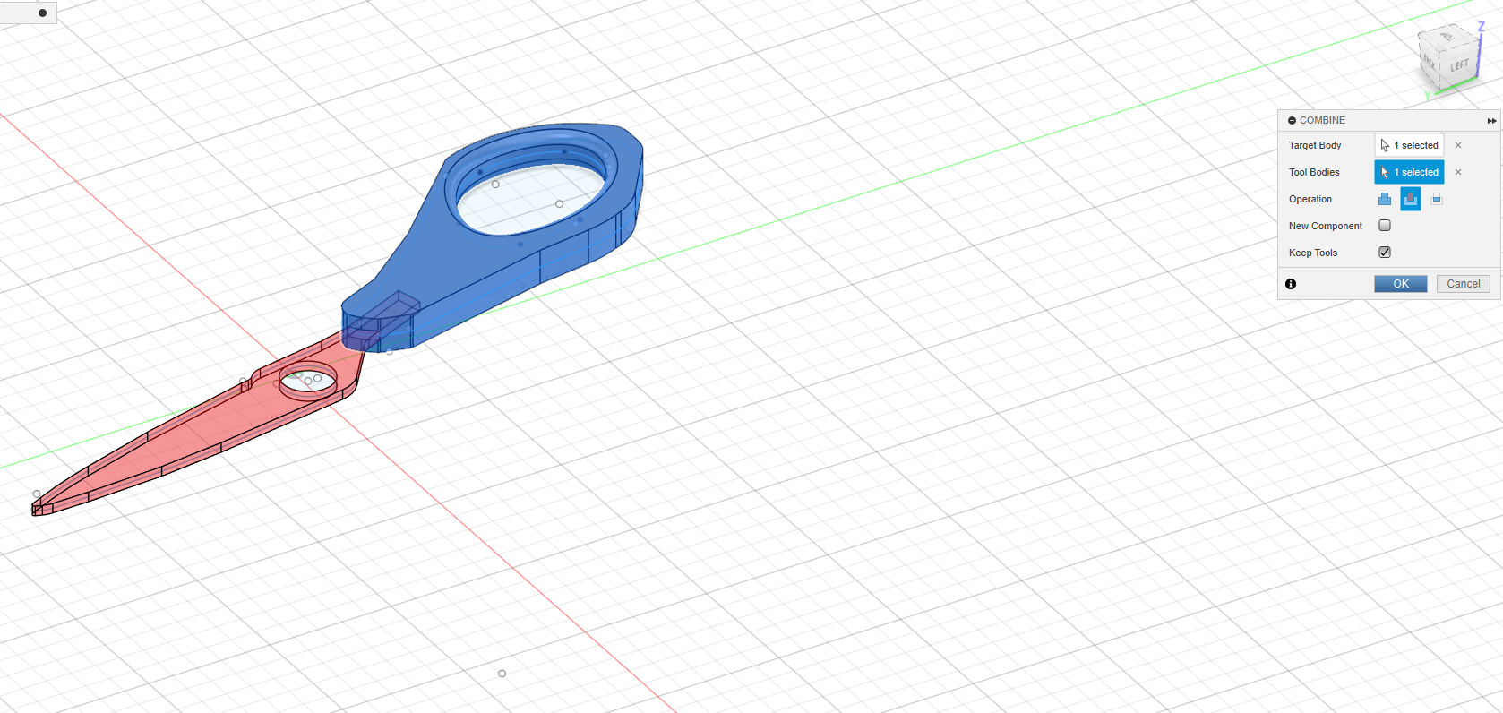 Combine - Target body - w czym wycinamy, pozniej Tool bodies - czym tniemy, wybieramy typ Operacji - cut i zaznaczamy Keep Tools