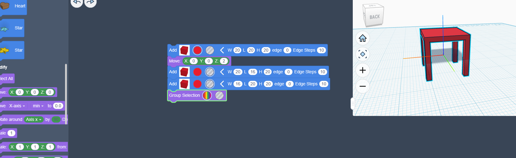 stolik - robimy boxa, podnosimy go, dodajemy kolejne dwa boxy odpowiednio pomniejszone wymiary i zaznaczamy hole - dziura, na koniec grupujemy obiekty.