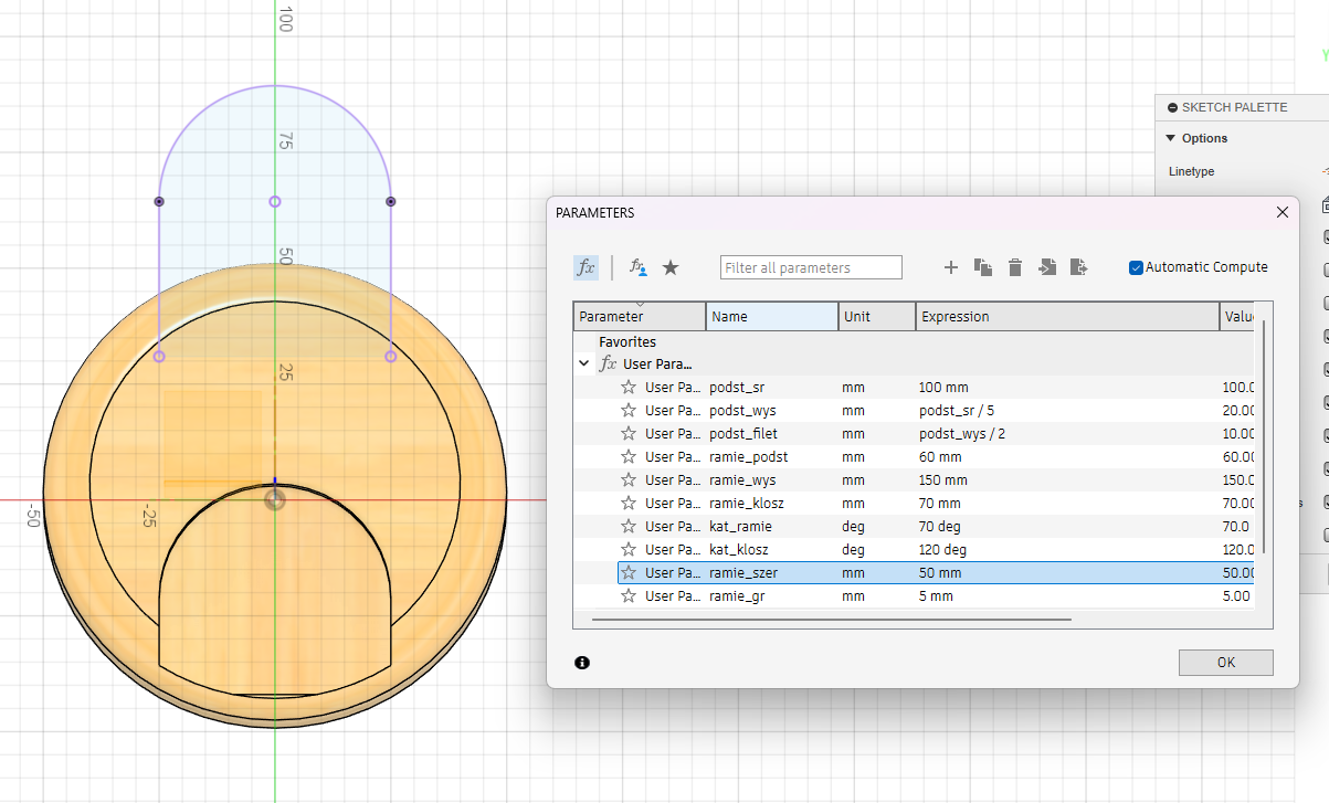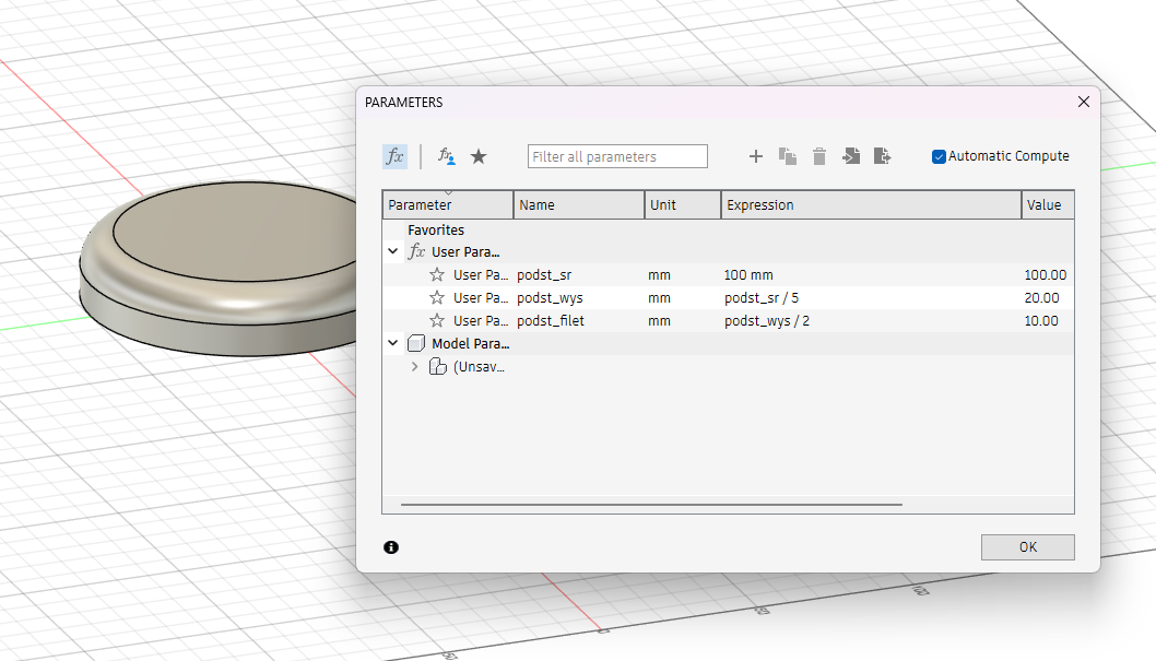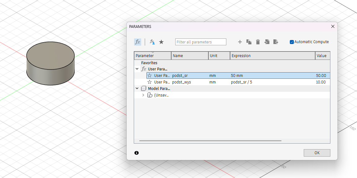 Modify - Change parameters, pojawia sie okno, wybieramy plusik, nazywamy parametr, wstawiamy (Expression)wartosc lub dzialanie. Edytujemy szkic - edit sketch na osi czasu i np na wymiarze wpisujemy nazwę parametru. Edytujemy extrude - Edit extrude i edytujemy wysokosc body - w wartosci wpisujemy nazwe parametru.