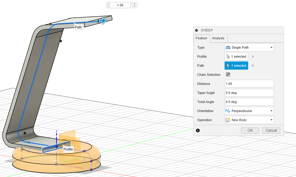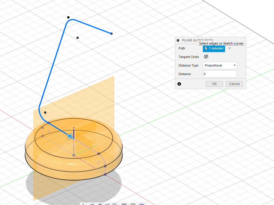 Construct - dodajemy płaszczyznę, wybieramy Plane Along Path - pokazujemy ścieżkę i Distance - wybieramy 0 (zero) jako poczatek sciezki. pozniej rysujemy profil i wybieramy Sweep.