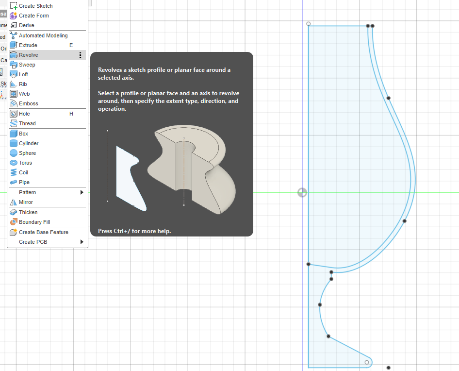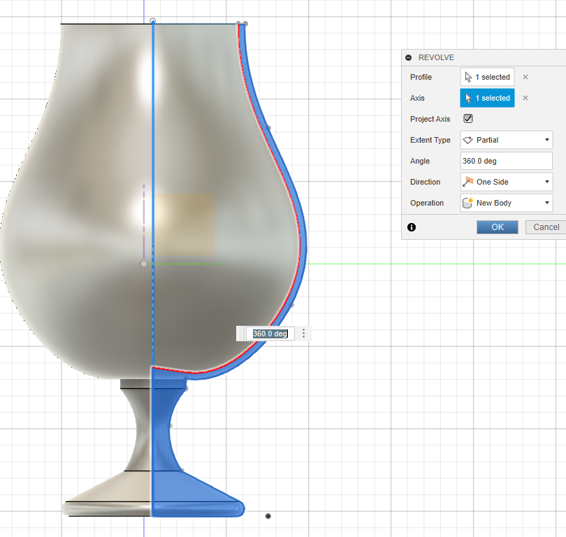 Revolve - wyciagniecie przez obrót. musimy miec profil i os obrotu. Oś symetrii nie moze byc w środku profilu.