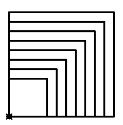 for. W każdej iteracji pętla nakazuje żółwikowi aby narysować kolejny kwadrat, a następnie przygotowywać żółwia do narysowania następnego . Długość boku każdego kolejnego kwadratu rośnie z każdą iteracją i przyrost ten jest zdefiniowany za pomocą stałejodstep.
