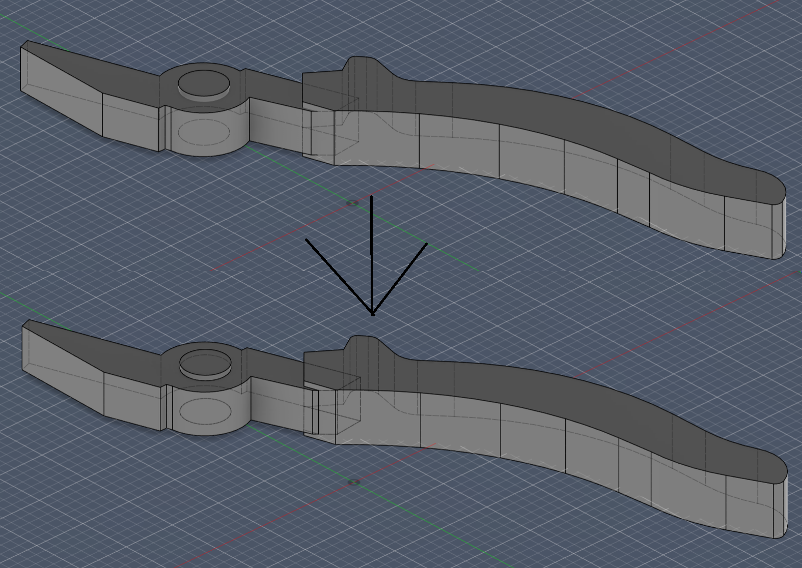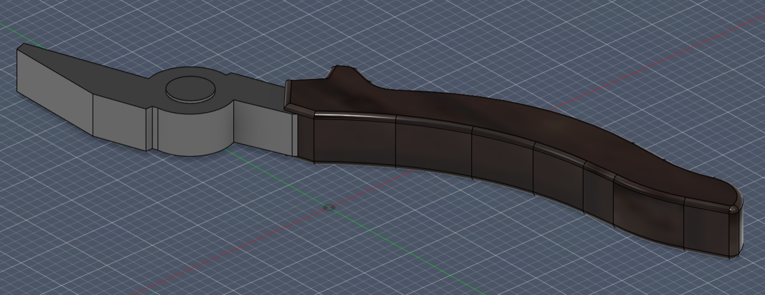 Jednak na razie wygląda to trochę dziwnie. Więc zmieniłam pozycje samej rączki (którą zrobiłam wyższą) i wycinam w nim dziurę na szczypce kombinerek, używając ich szkicu i narzędzia extrude. Tak samo robię dziurę na śrubę.