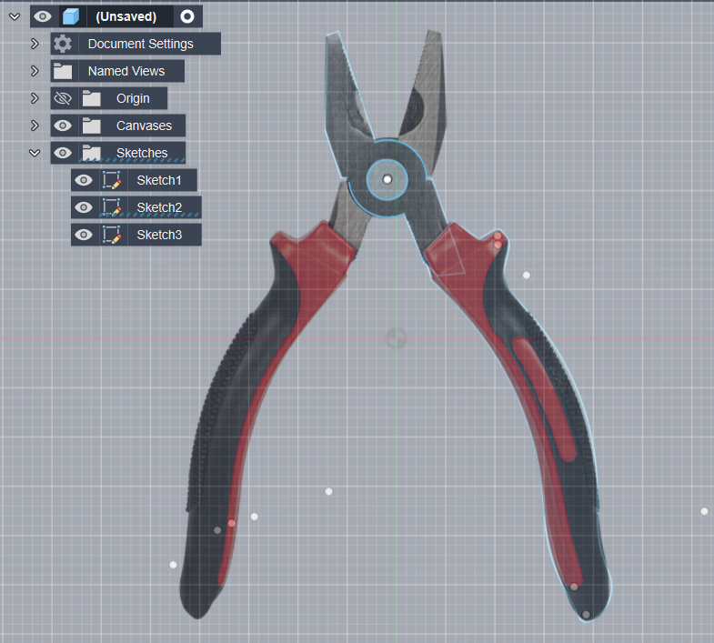 Po czym użyć narzędzia z grupy insert nazywającego się canvas, by umieścić znalezione zdjęcie na płaszczyźnie. Te kombinerki składają się z 3 części: rączki, śrubki i szczypiec kombinerek. Więc trzeba zrobić 3 inne sketch'e.