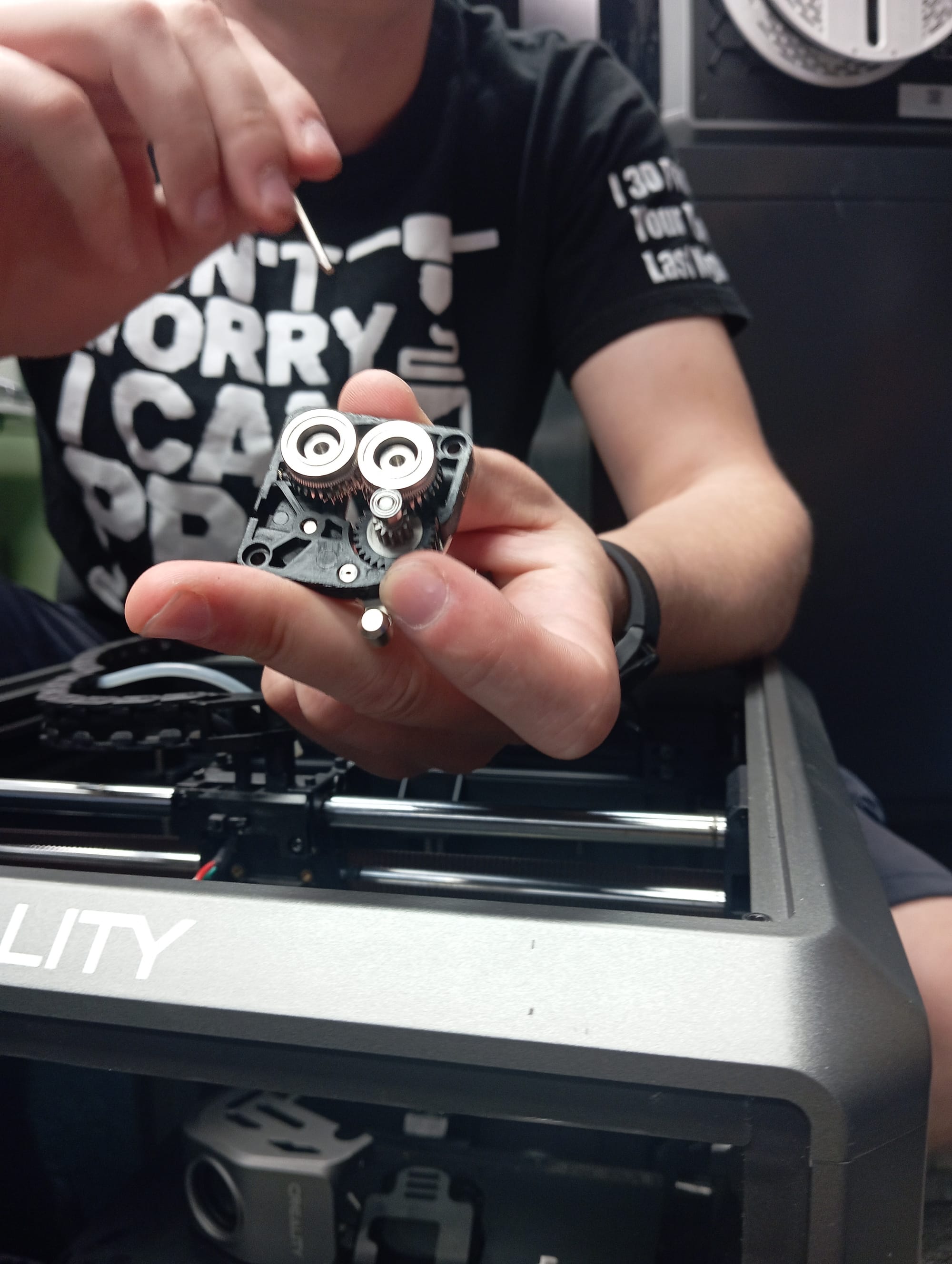 Ekstruder ma wbudowany radiator, radełka, mechanizm z kół zębatych i silnik krokowy