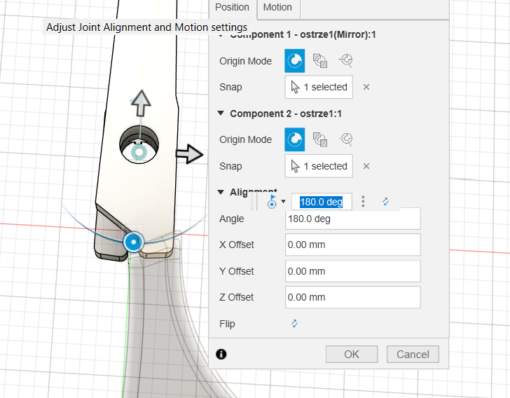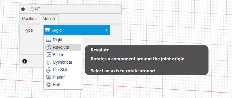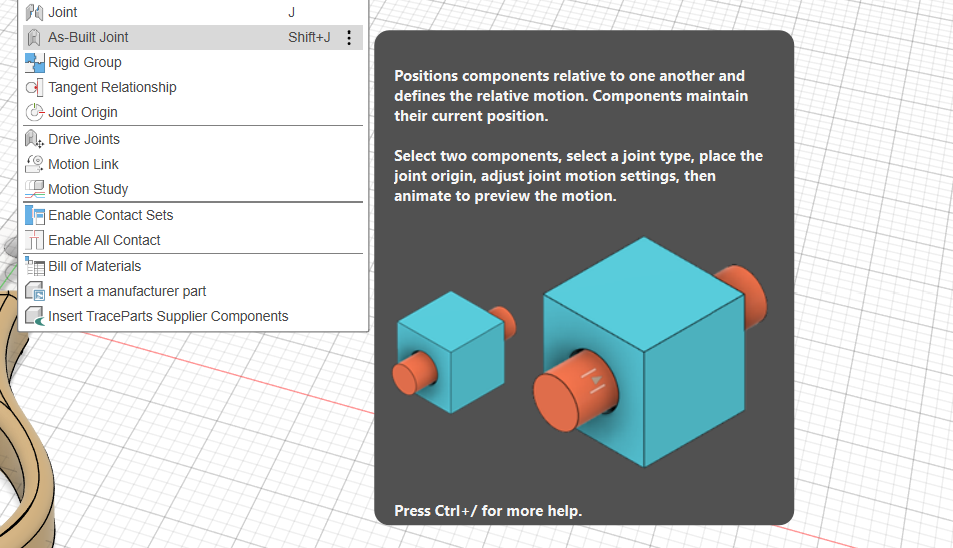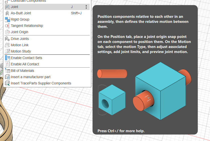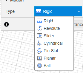 - joint - połączenie, w którym w projekcie komponenty nie znajdują się w docelowym położeniu (we Fusion działa to też w chmurze, więc jeśli wiele osób projektuje różne elementy, to później w projekcie - matce można je połączyć, ale też są edytowalne przez tamte osoby)