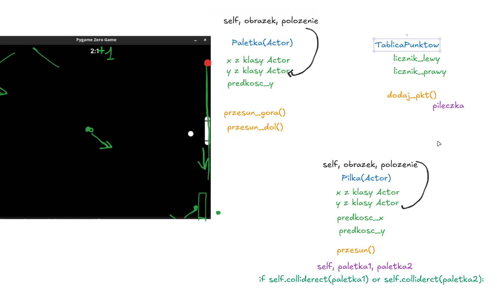 def przesun(self, paletka1, paletka2): ->Przyjmuje obie paletki jako parametry do sprawdzania kolizji.