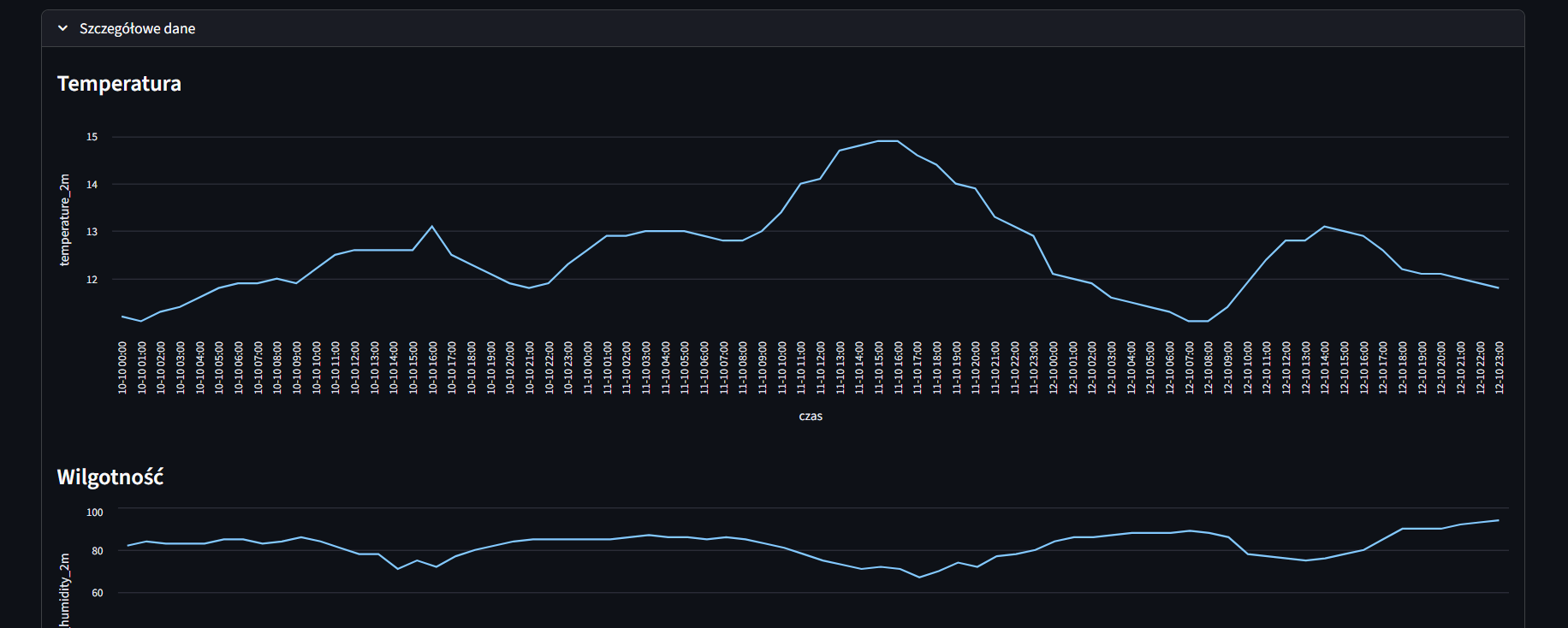 # Szczegółowe dane pogodowe: wykresy i tabela