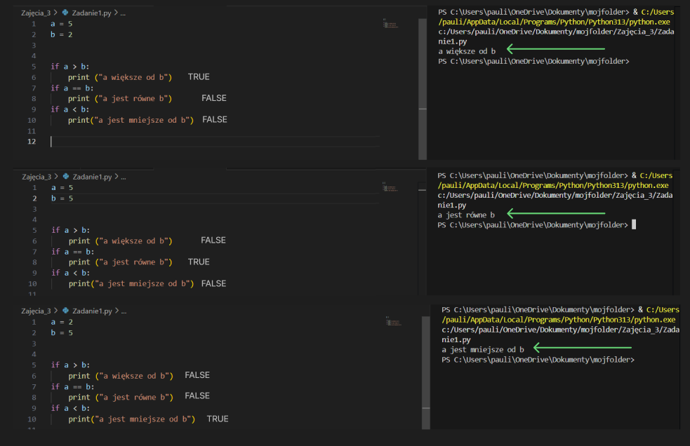 Trzeba pamiętać o wcięciach - decydują one o tym co python wykona po podjęciu decyzji.