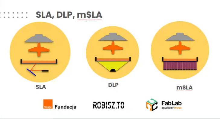 Technologie różnią się źródłem światła. Najpierw SLA - laser. DLP - rzutnik. mSLA - wykorzystała ekrany LCD (światło LED)