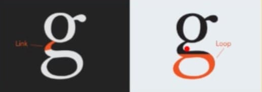 LINK łącznik - to kreska łącząca górny brzuszek z dolną pętlą minuskuły g; LOOP pętla;