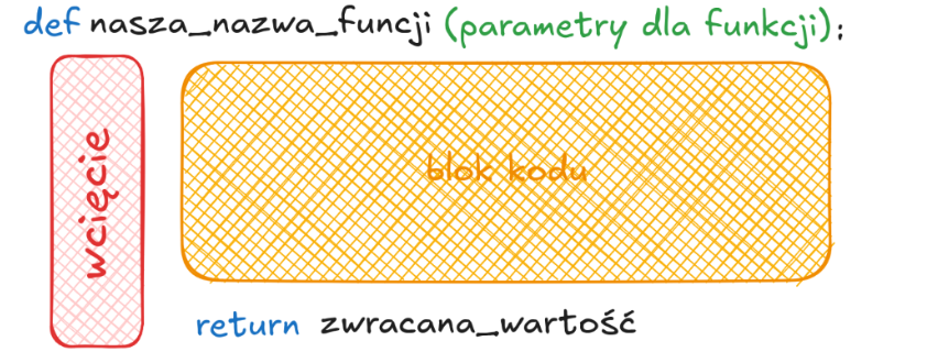 return wynikSłowo return - wykorzystujemy je jeśli chcemy, żeby nasza funkcja poza wykonaniem jakiejś operacji zwróciła nam jakąś wartość (którą np. możemy przypisać do zmiennej). Bardzo dużo funkcji korzysta z tej opcji - np. funkcja sum zwraca nam sumę dwóch liczb, funkcja max zwraca nam największą wartość przechowywaną chociażby na liście itd.