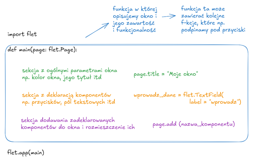 flet.app(main)WAŻNE!!! Aplikację zbudowanej z framework-iem Flet lepiej uruchamiać przez flet run nazwapliku.py, a nie przez guzik "play" w VSCode czy python nazwapliku.py". Uruchomienie poprzez flet run` powoduje, że nie musicie cały czas zamykać i otwierać okna po zaktualizowaniu aplikacji - zmiany wczytają się automatycznie.