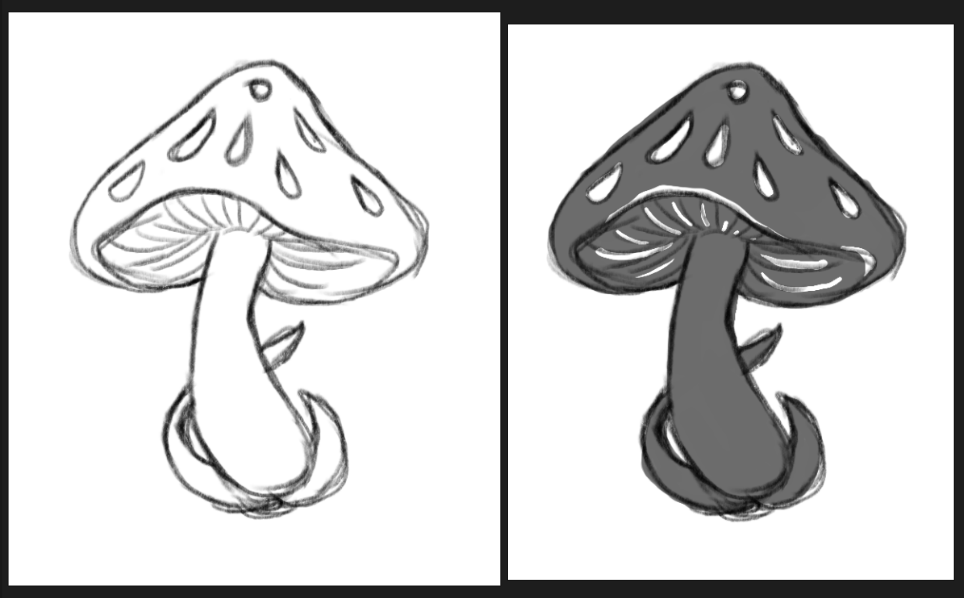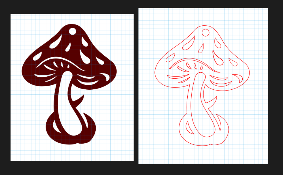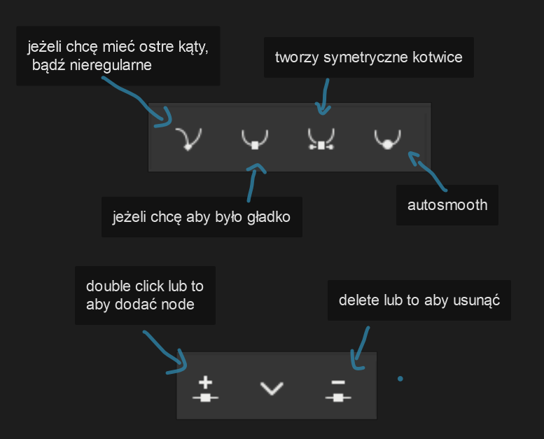 Grziba w wektorach robię w Inkscape, używam pen toola (B), selector toola (V) i node toola (A) aby odwzorować kształt. Skróty ustawiam sama, więc nie są to oryginalne z programu. Podczas obrysu używam różnych opcji node (u góry ekranu)