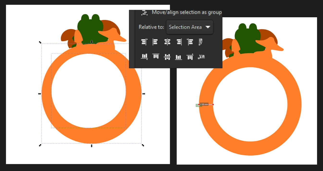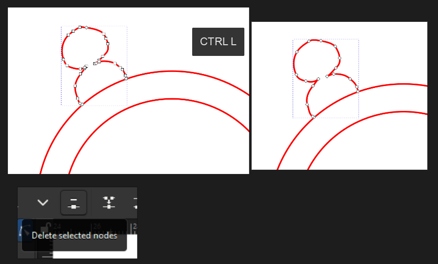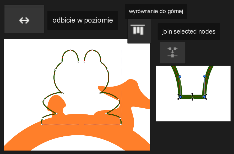 Aby zachować symetrię rysuję pół obiektu, następnie go duplikuję poprzez zaznaczenie Layers>PPM>duplicate, aby uniknąć rozbieżności. Przesuwam go z CTRL i odwracam przyciskiem odbicia. Dla pewności wyrównuję przyciskiem równania do górnej krawędzi oba kształty. Łączę je w jedno za pomocą join selected nodes.