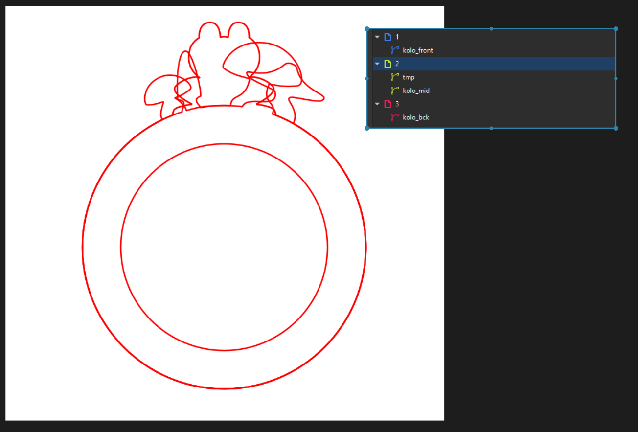 Wszystko staram się nazywać, aby nie mieć bałaganu w projekcie, każdy okrąg jest na osobnej warstwie. Czerwony outline, aby szybko ustawić dla wszystkich obiektów > zaznaczam wszystko, następnie LPM na dole ekranu