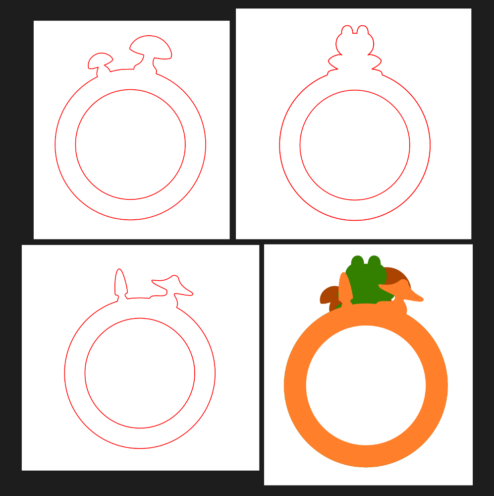 Pierścionek zaczynam od zrobienia dwóch okręgów (elipse + ctrl + shift by były równe) i rysowania kształtów ołówkiem (P), następnie upraszczam je (CTRL+L), nadmiar nodów usuwam delete lub przyciskiem z pola edycji. Im mniej node tym łatwiej utrzymać płynne linie.