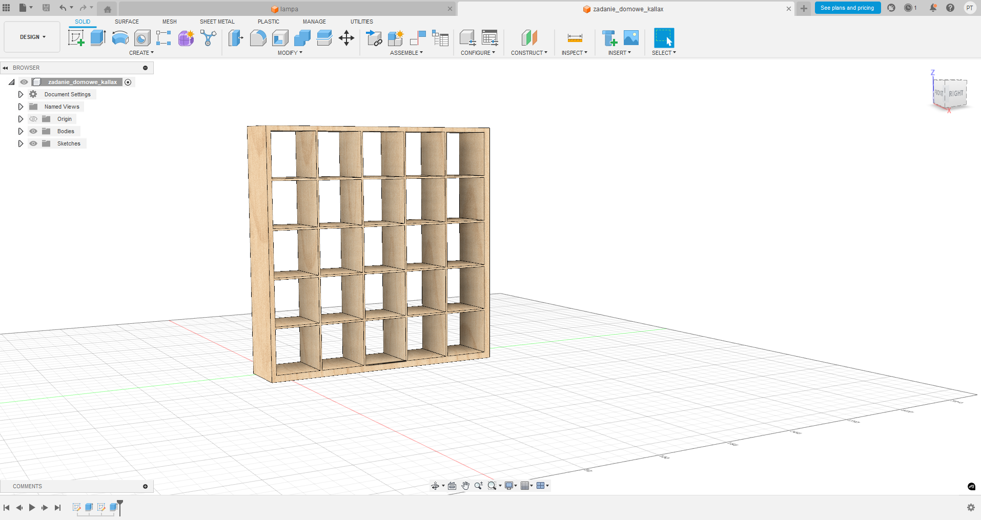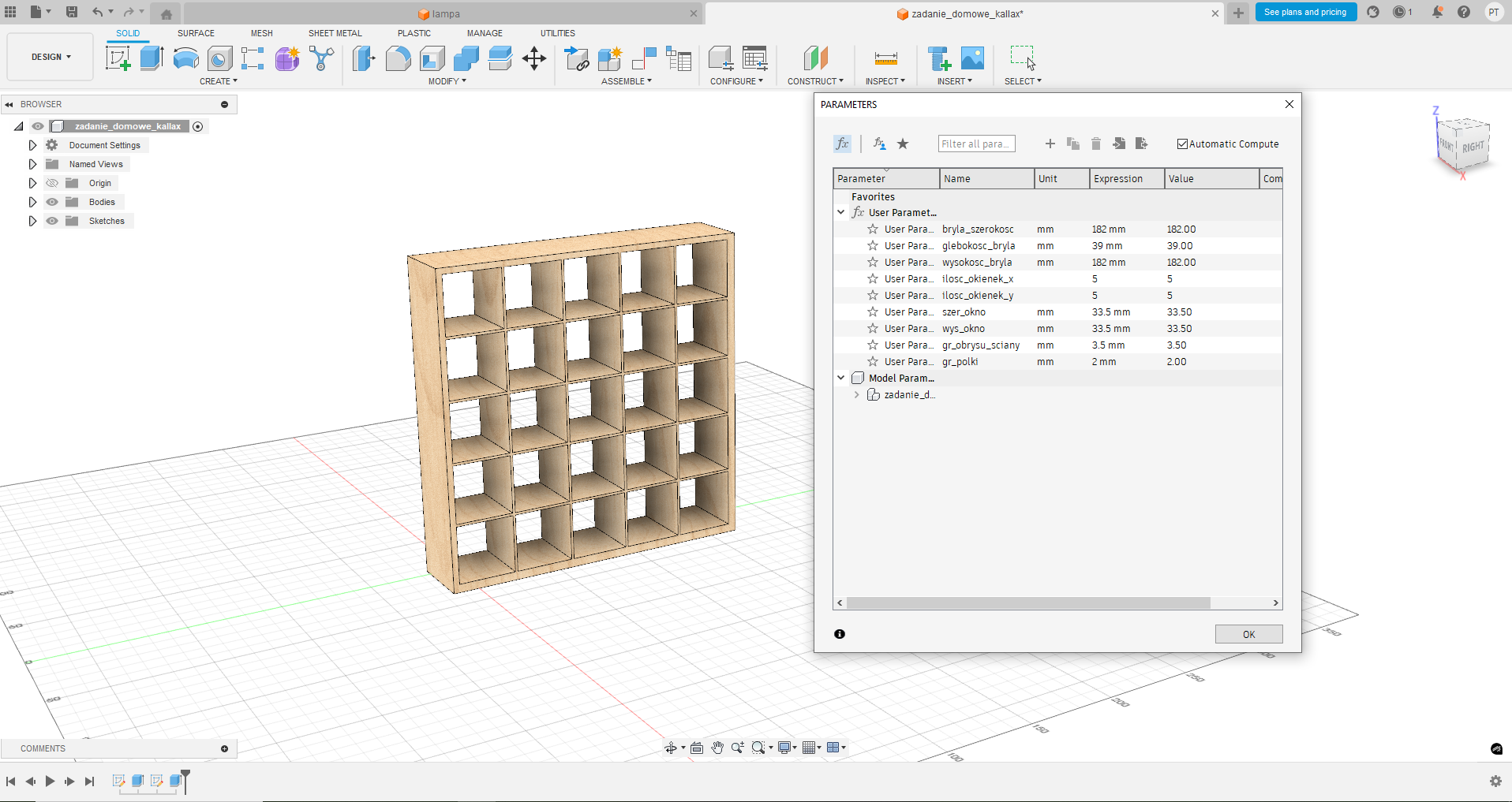 Bryłę regału wyrysowałam poprzez wpisanie wszystkich wymiarów ze strony w okno parameters. Do stworzenia całości użyłam narzędzi extrude oraz rectangular pattern.