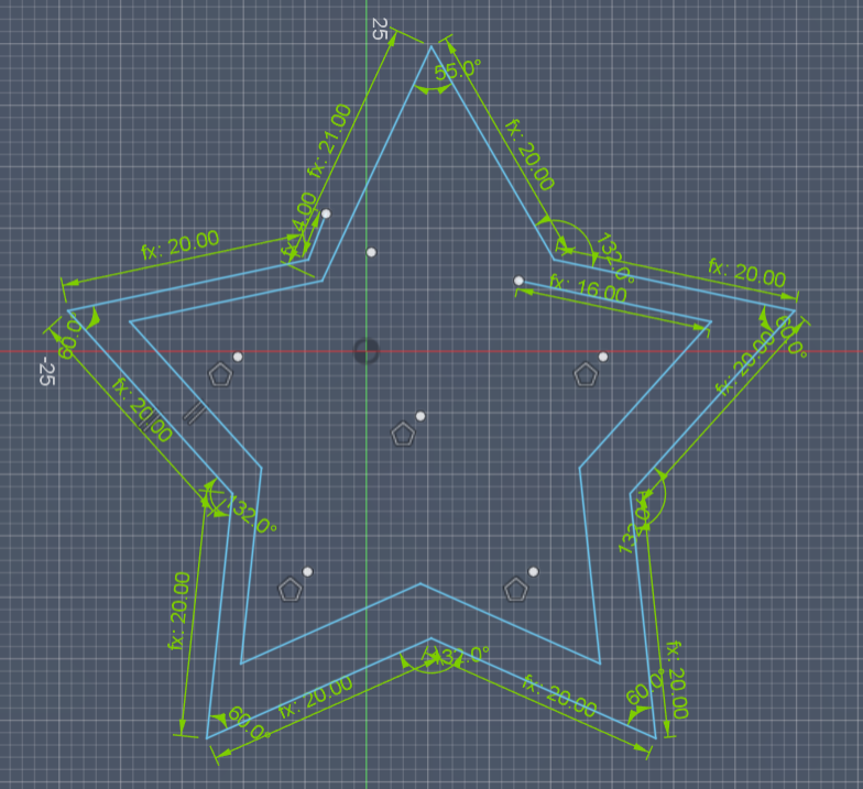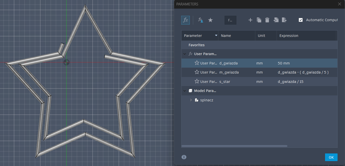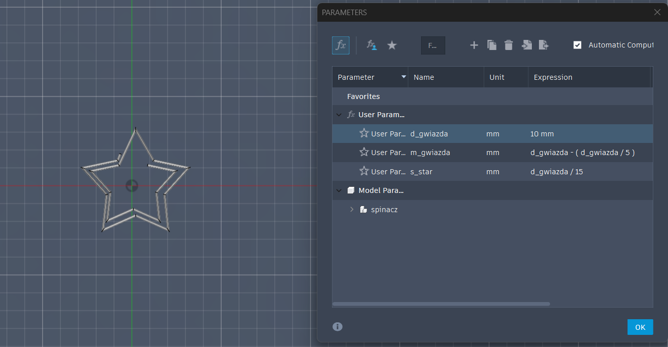 Jak widać na zdjęciu użyłam w całym modelu 3 parametrów, 2 do samych boków tworzących gwiazdki i jeden do którego wrócę później.