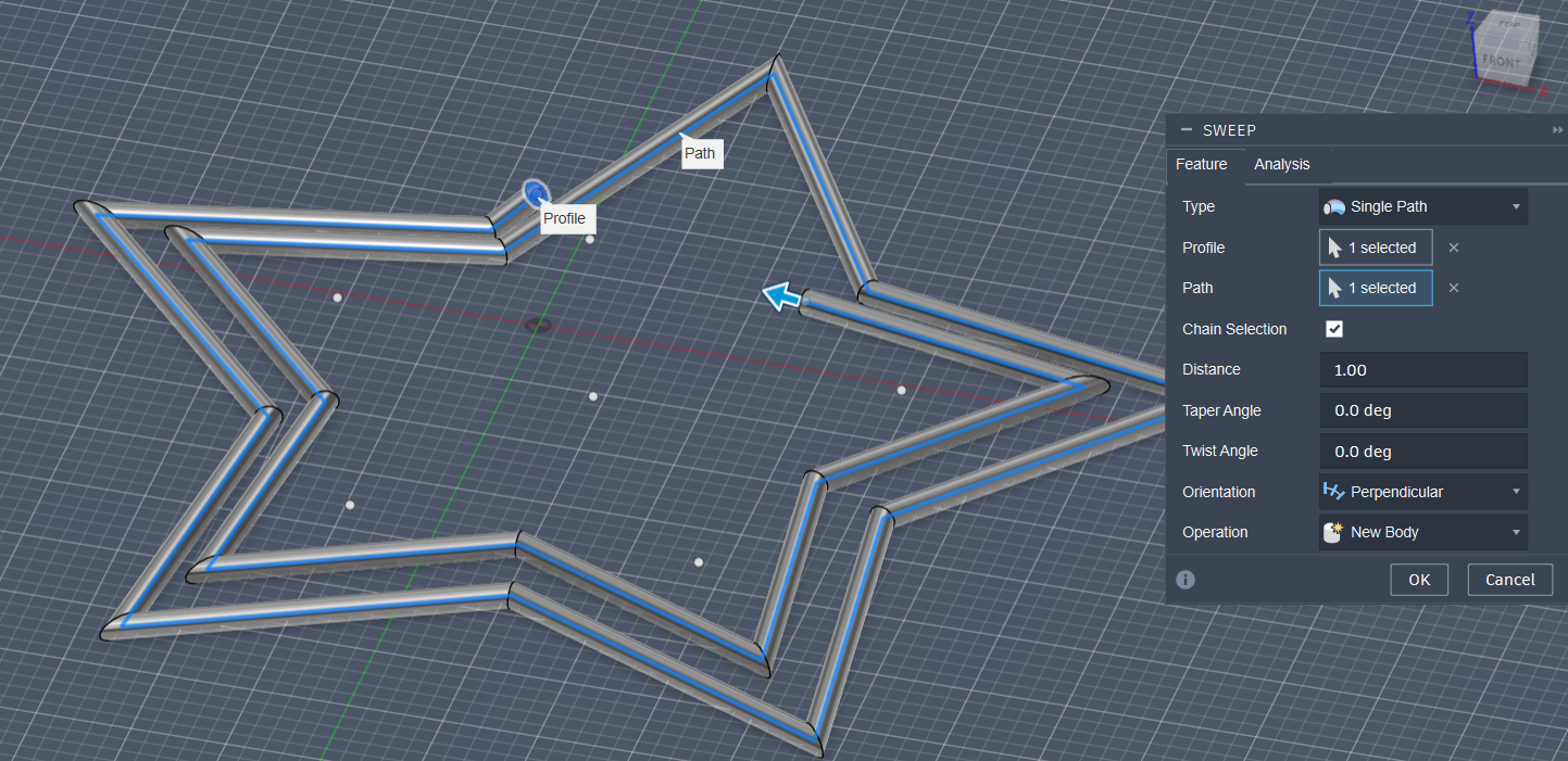 Ostatnia rzecz do zrobienie to zmienienie obu tych obrysów w model 3d, możemy to zrobić za pomocą narzędzia "sweep" w grupie create.