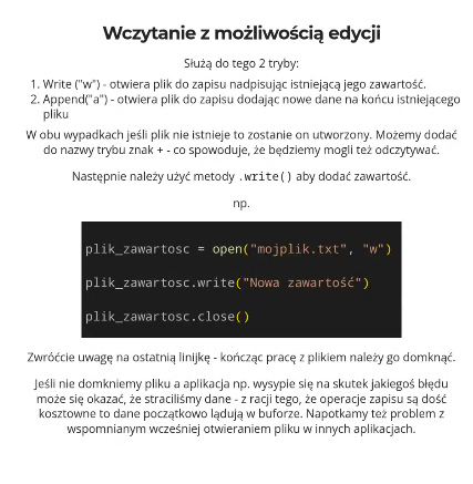 - ("w", zamiast "r") - de facto nadpisuje starą zawartość nową, przez co można przez nieuwagę przypadkiem skasować zawartość pliku!