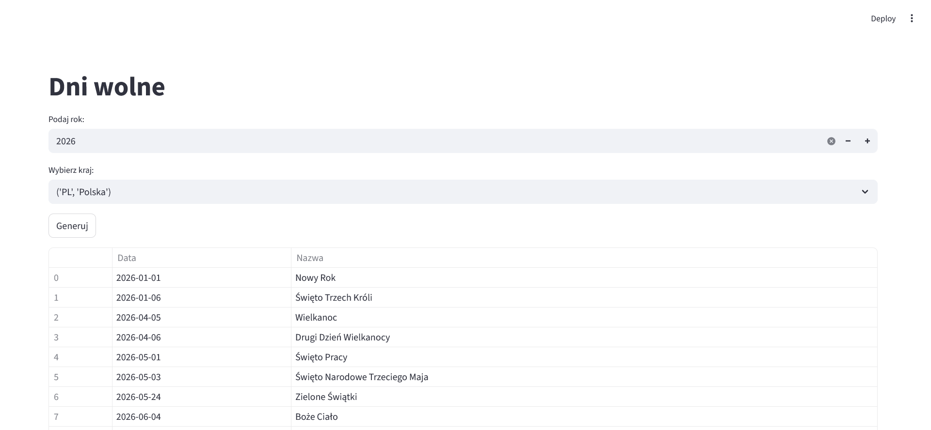 Aplikacja do wyświetlania dni wolnych od pracy w danym roku i kraju, z użyciem Streamlit