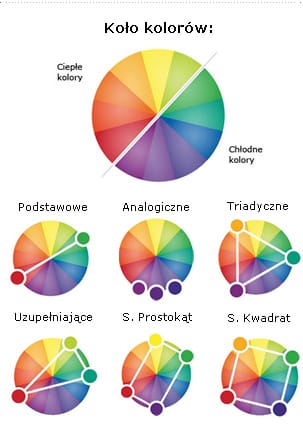 - barwy podstawowe (w tradycyjnym kole) czerwony, żółty, niebieski