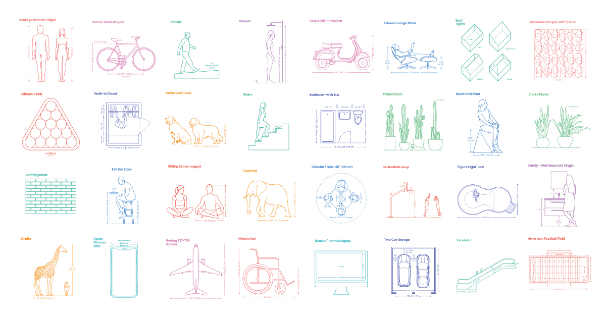 A comprehensive reference database of dimensioned drawings documenting the standard measurements and sizes of the everyday objects and spaces that make up our world.