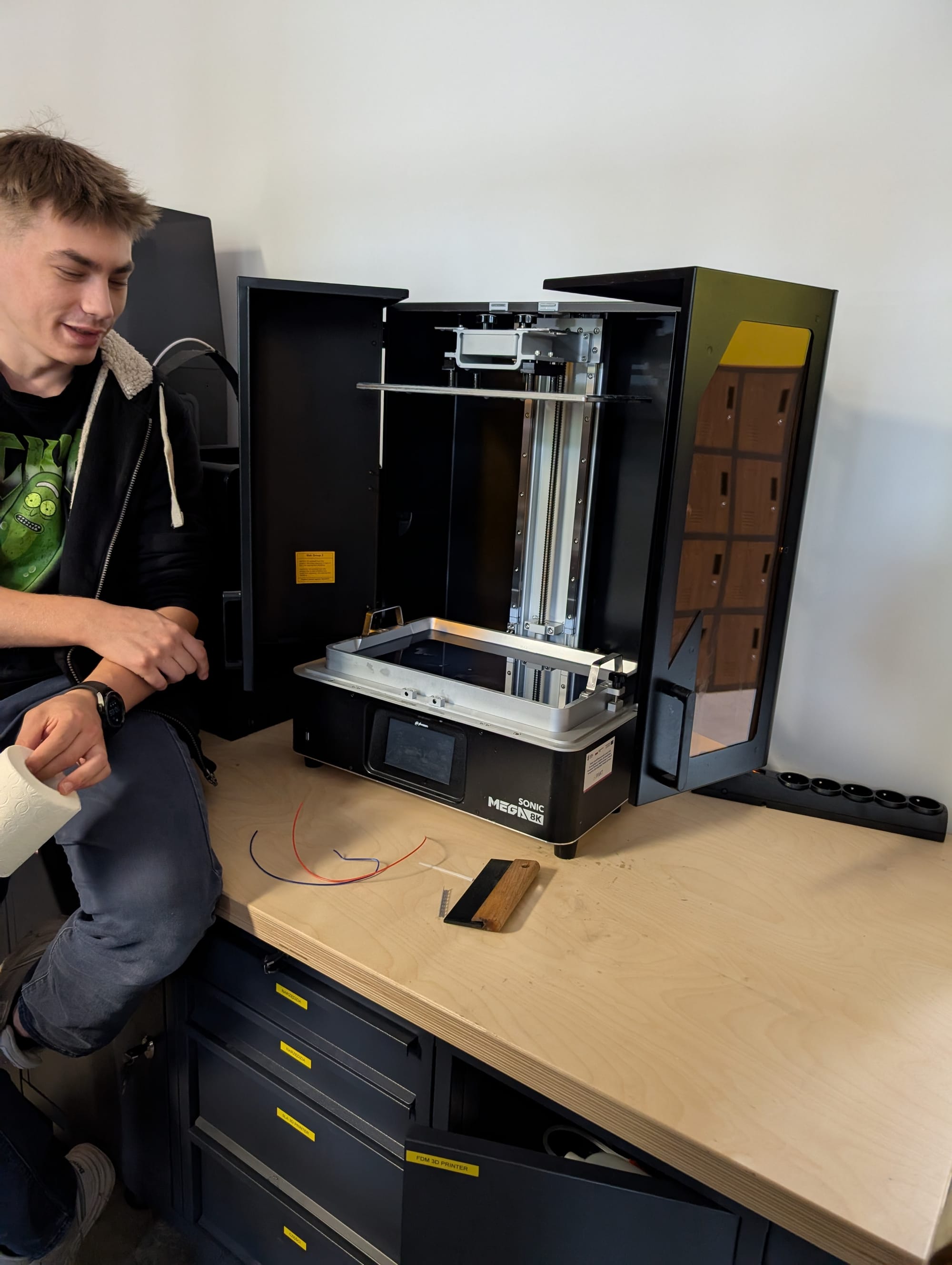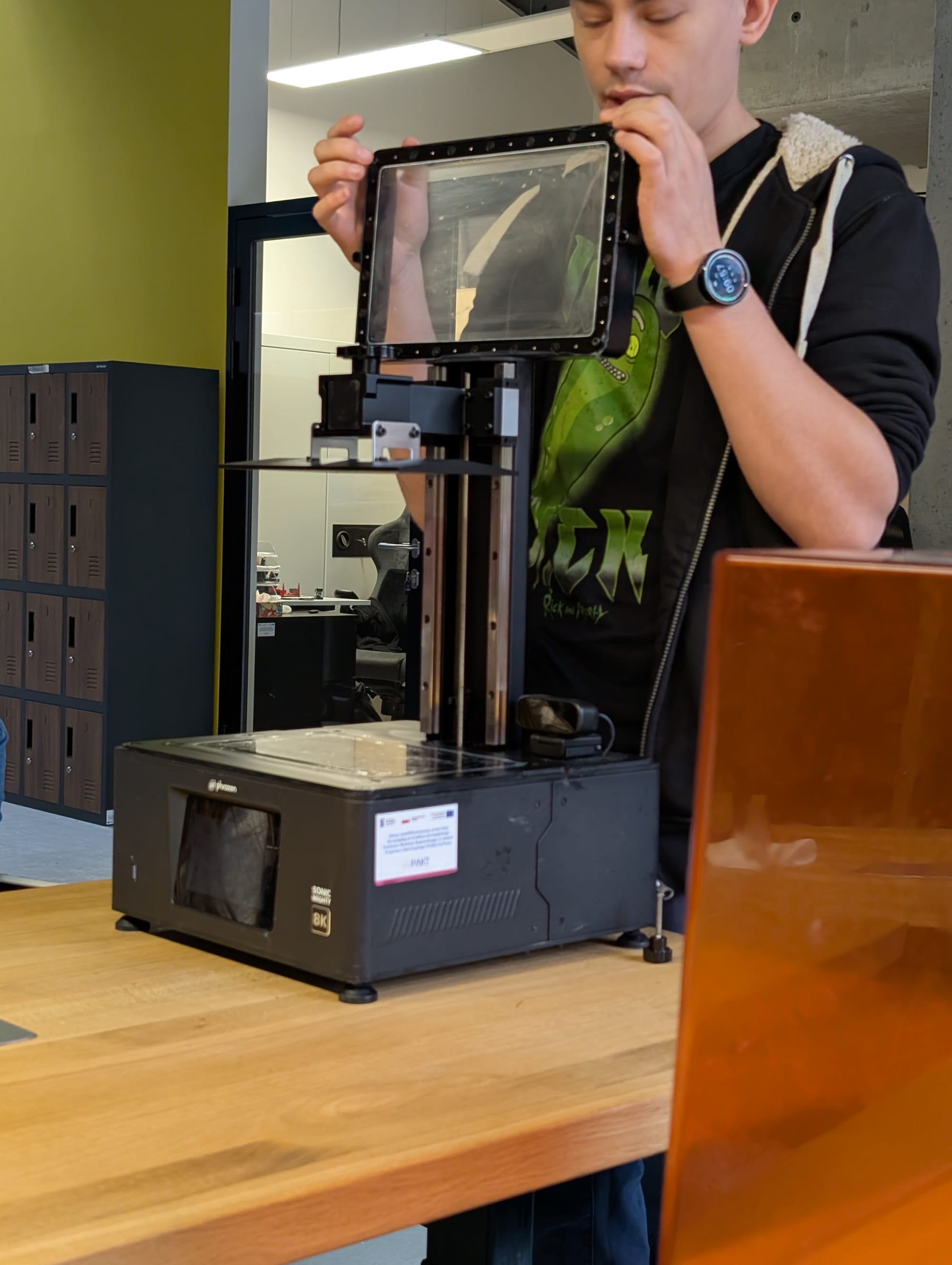 Żywica, stół roboczy (dokładność na wysokości 0,05 mm) zbiornik na żywice, folia FEB, drukujemy bardziej dokładne